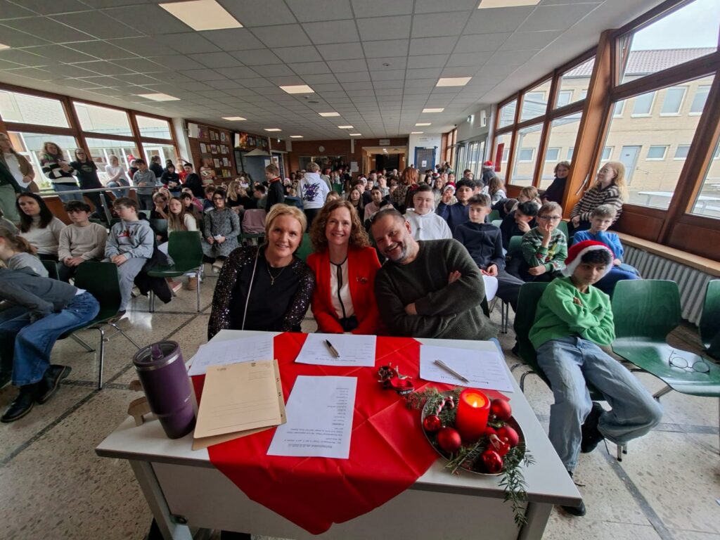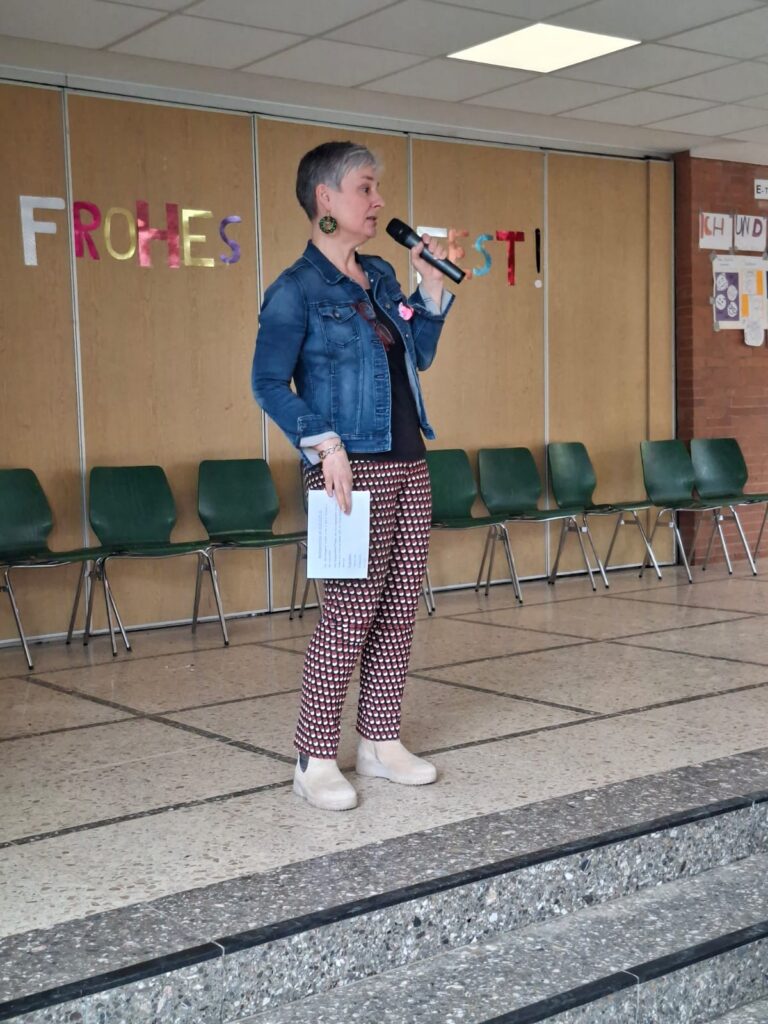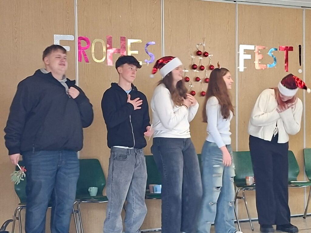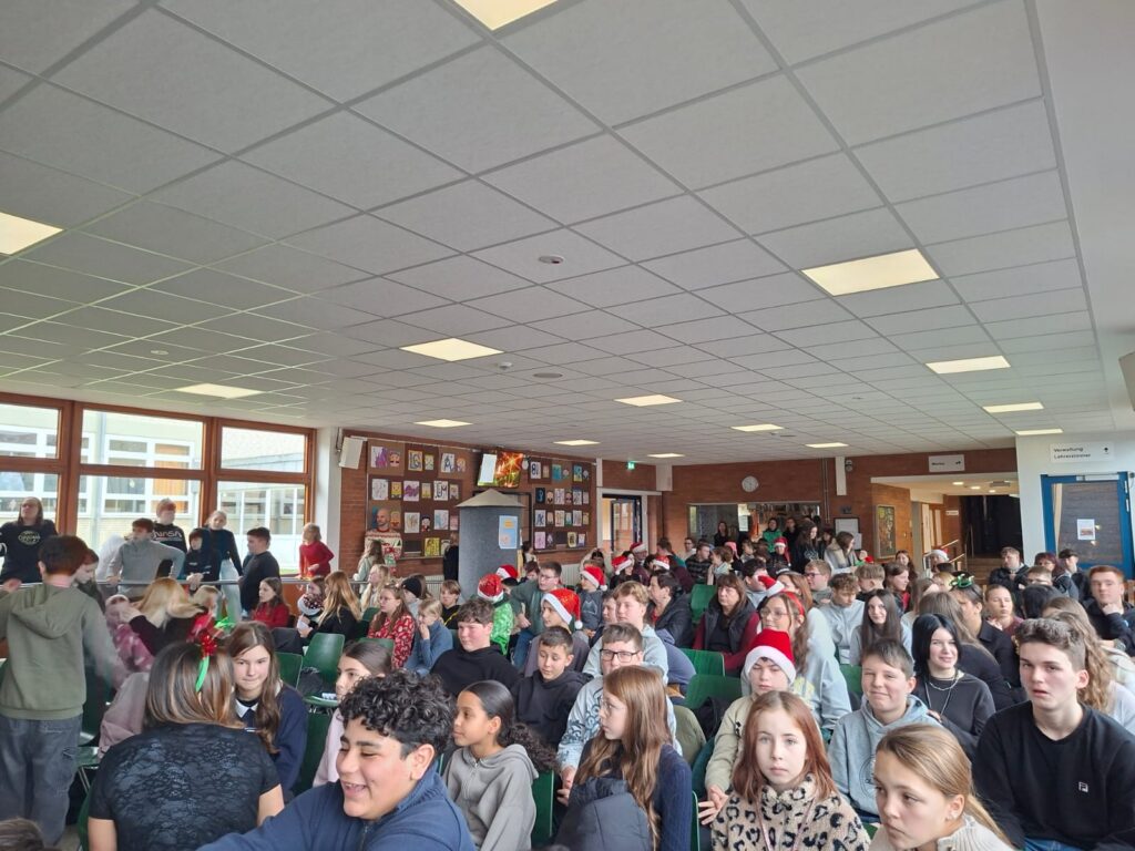 Frau Frölich begrüßte alle teilnehmenden Klassen in der weihnachtlich geschmückten Schulaula aufs Herzlichste.